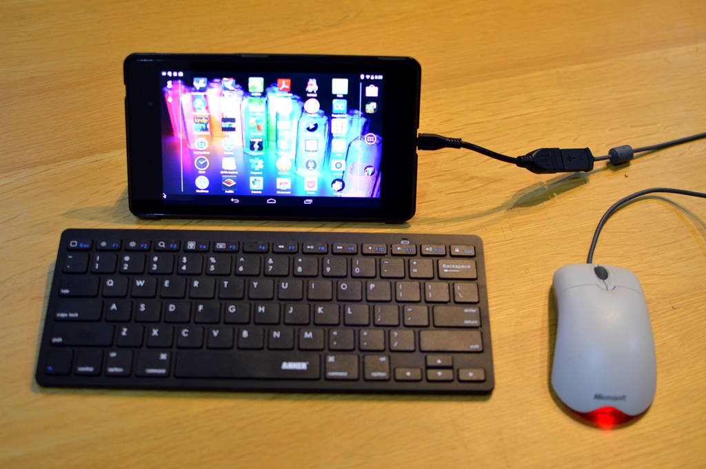 This made it much more usable as an input system, but somehow I now wanted to use a mouse as a pointer instead of leaning in to touch the screen from the keyboard sit-back position, and then I remembered I bought a USB OTG cable a while back to play with USB stick file systems on a rooted system. On a normal Nexus 7, you can’t use it for bulk storage, but it does work for a mouse, even an old Microsoft mouse you bought a decade ago in a bargain basement in Akiba.